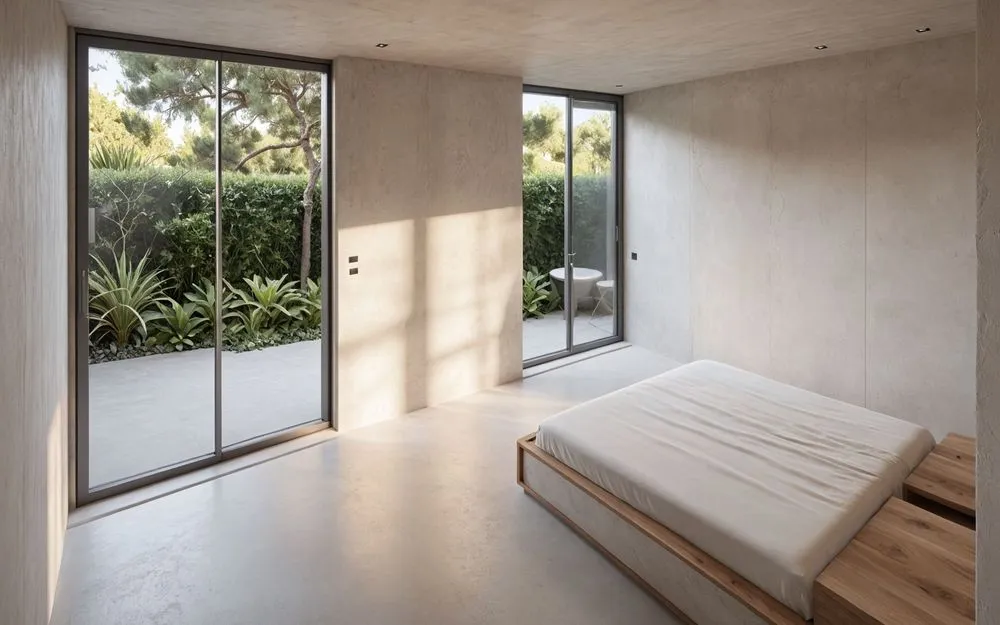 a bedroom with white walls, concrete floors, and wood furniture