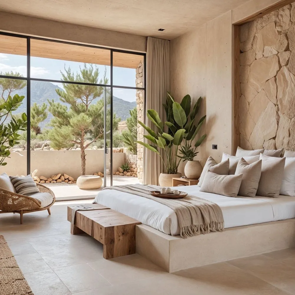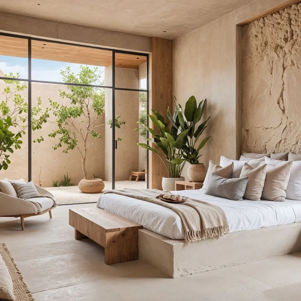 bedroom with natural theme, bed and large plants