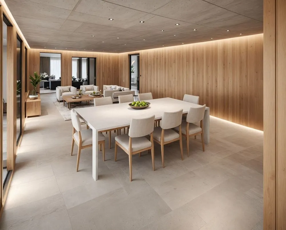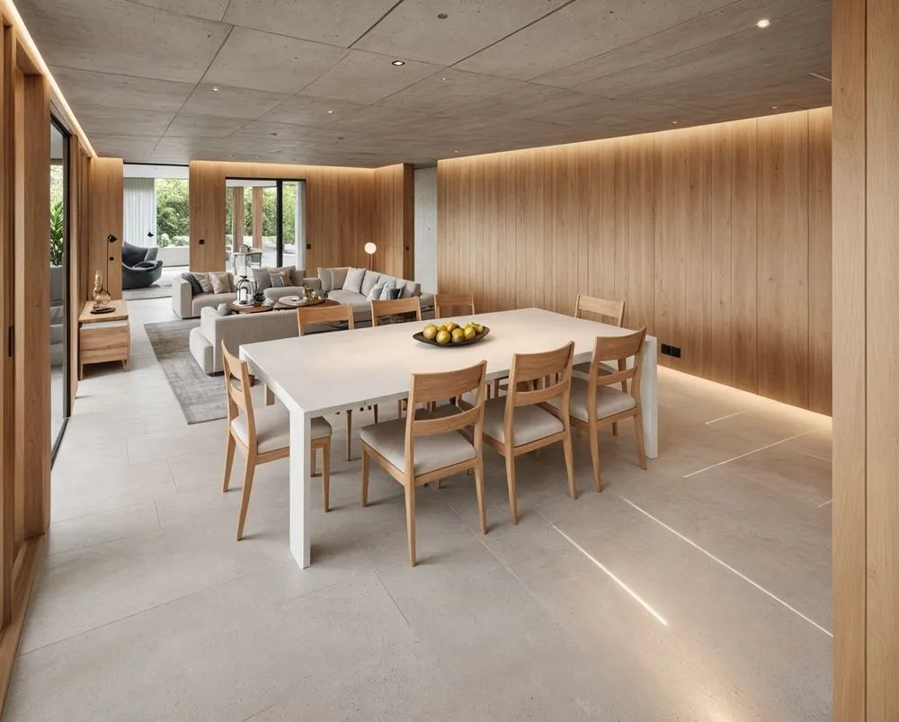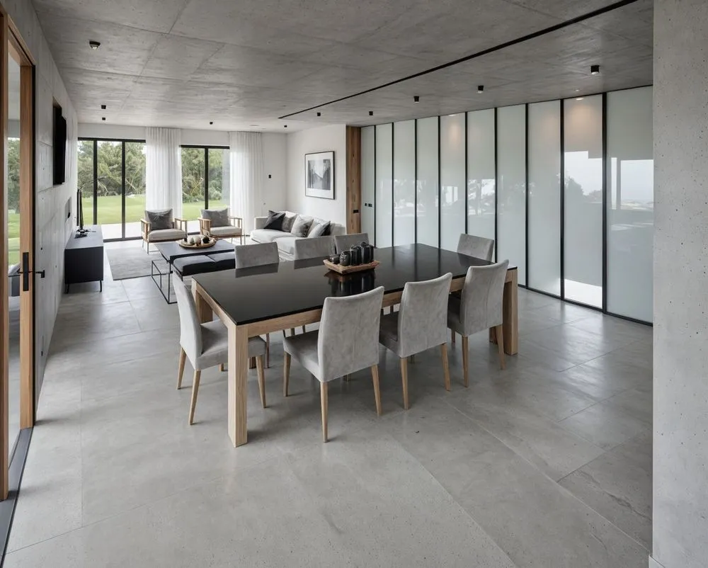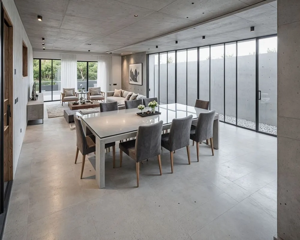 a table and chairs inside of a modern style home