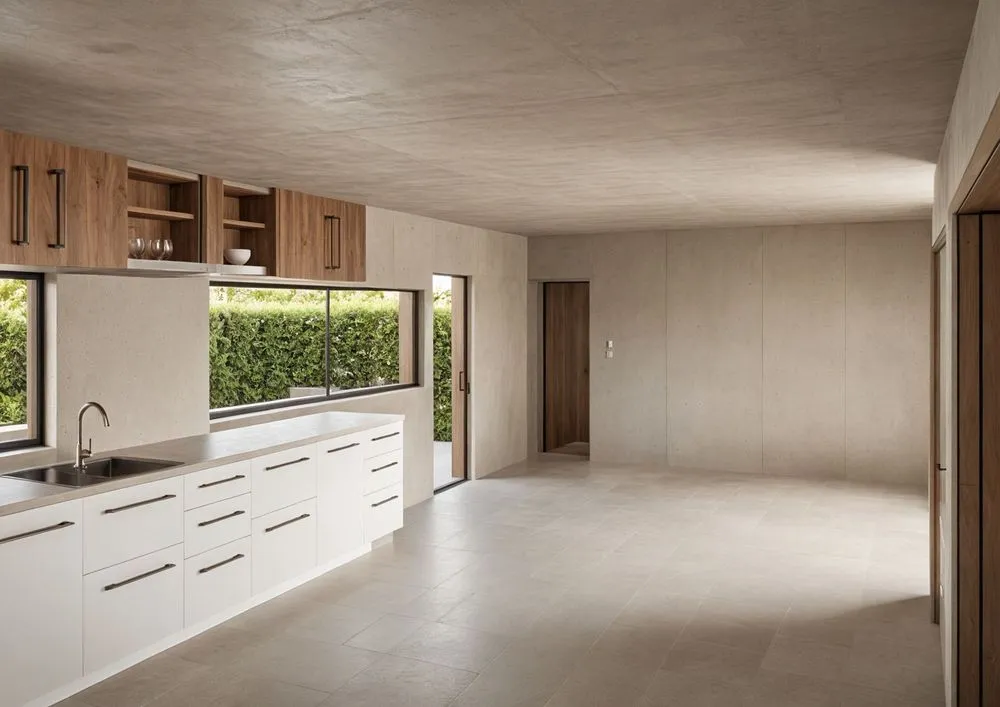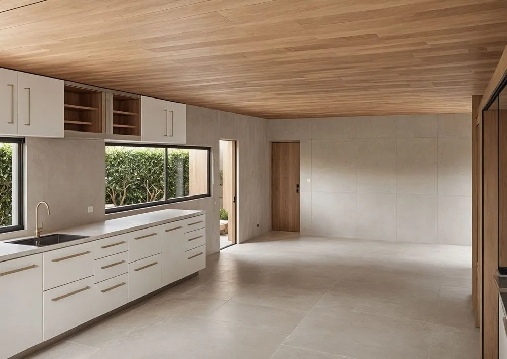 this is an empty modern kitchen with wooden cabinets