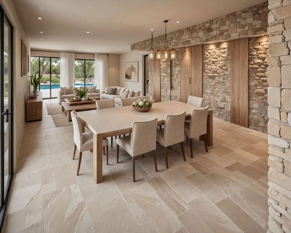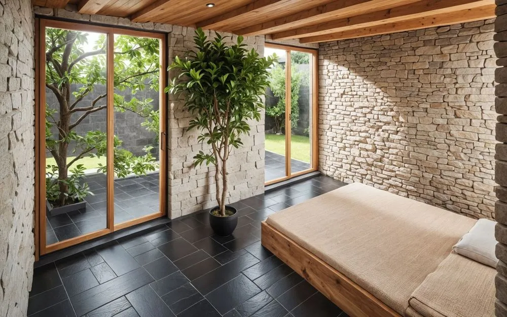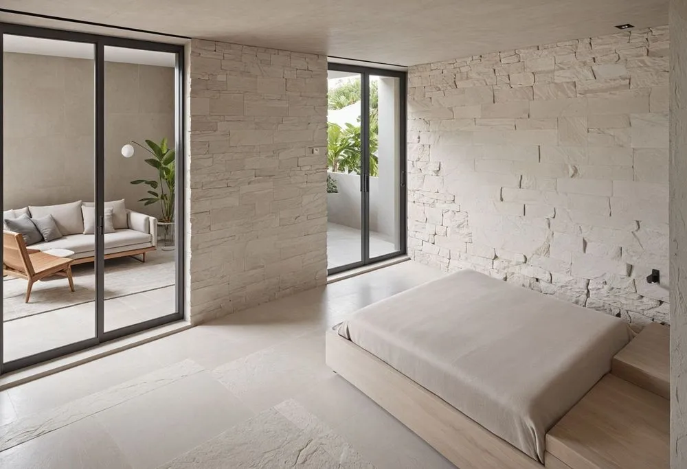 a spacious master bedroom with stone walls and flooring