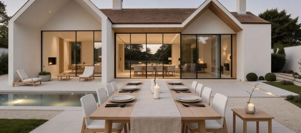 an outdoor dining table next to a large house