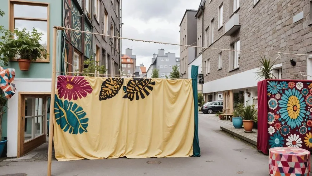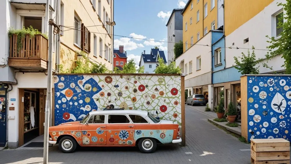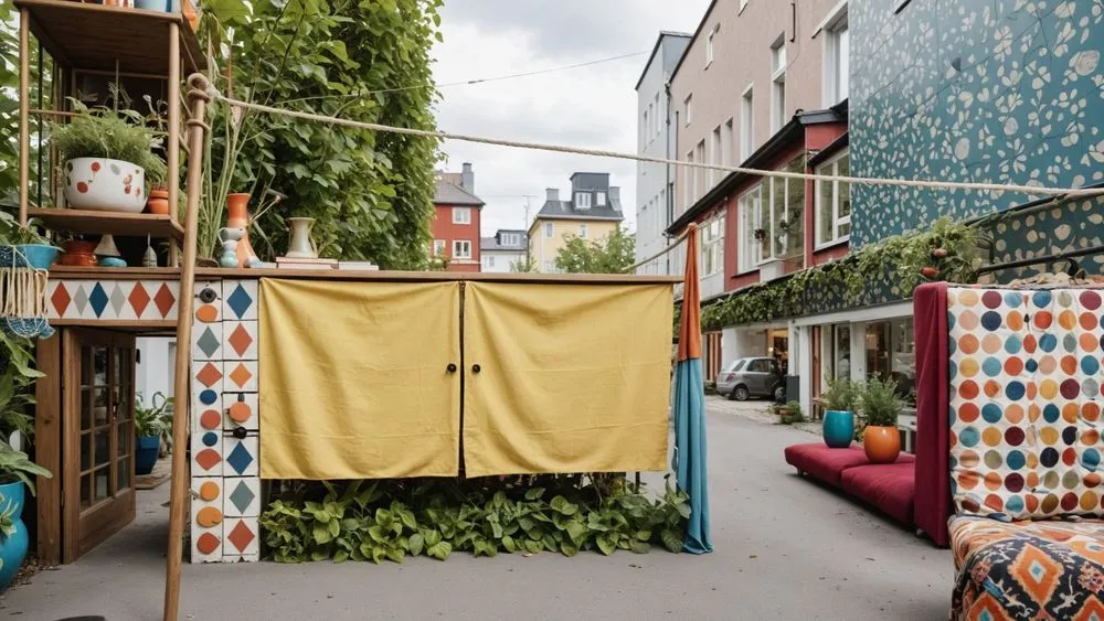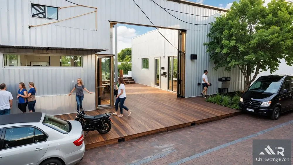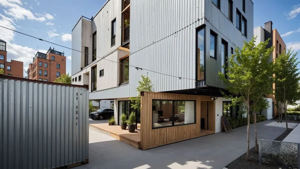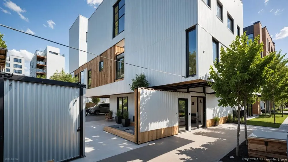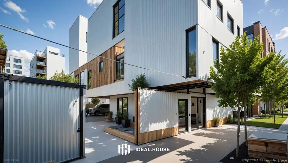 an outside courtyard with trees, a wooden bench and two modern style buildings