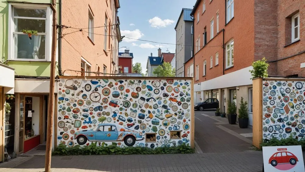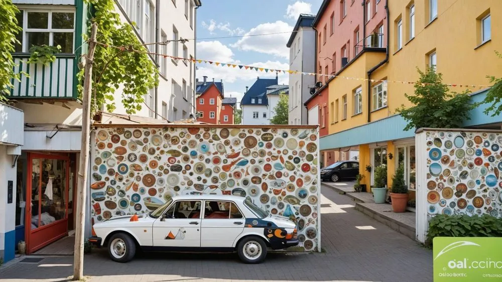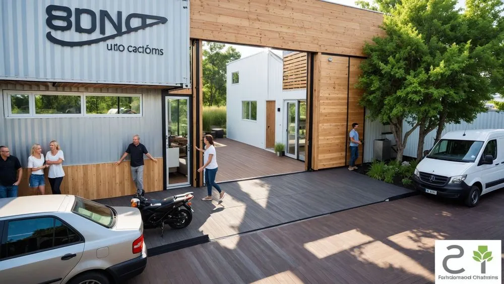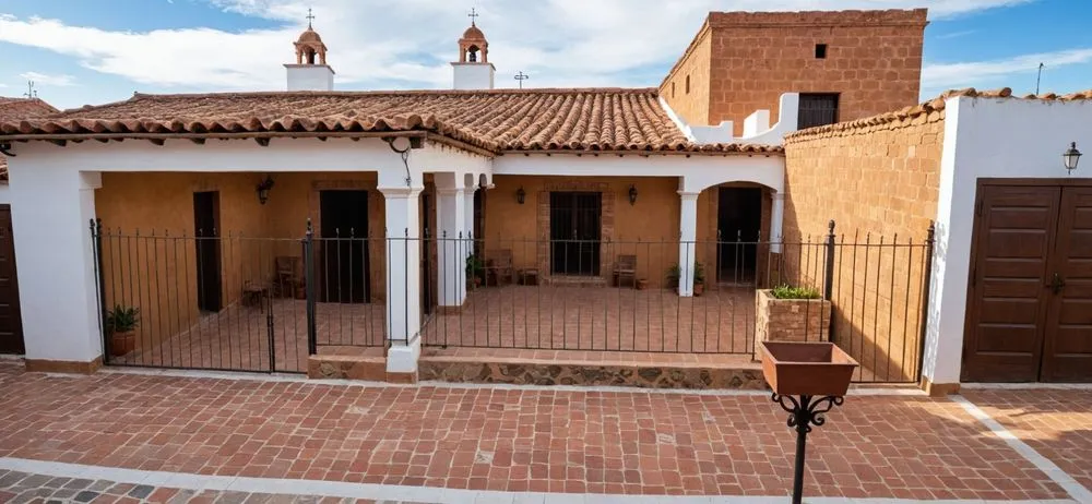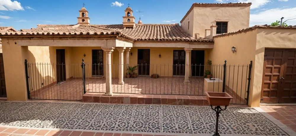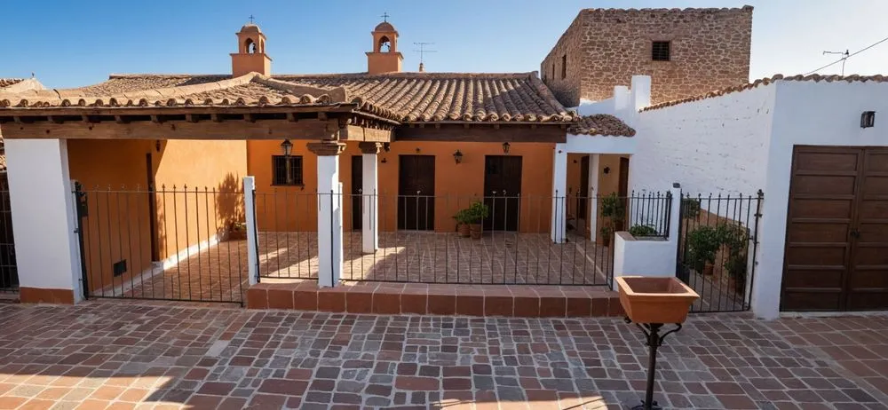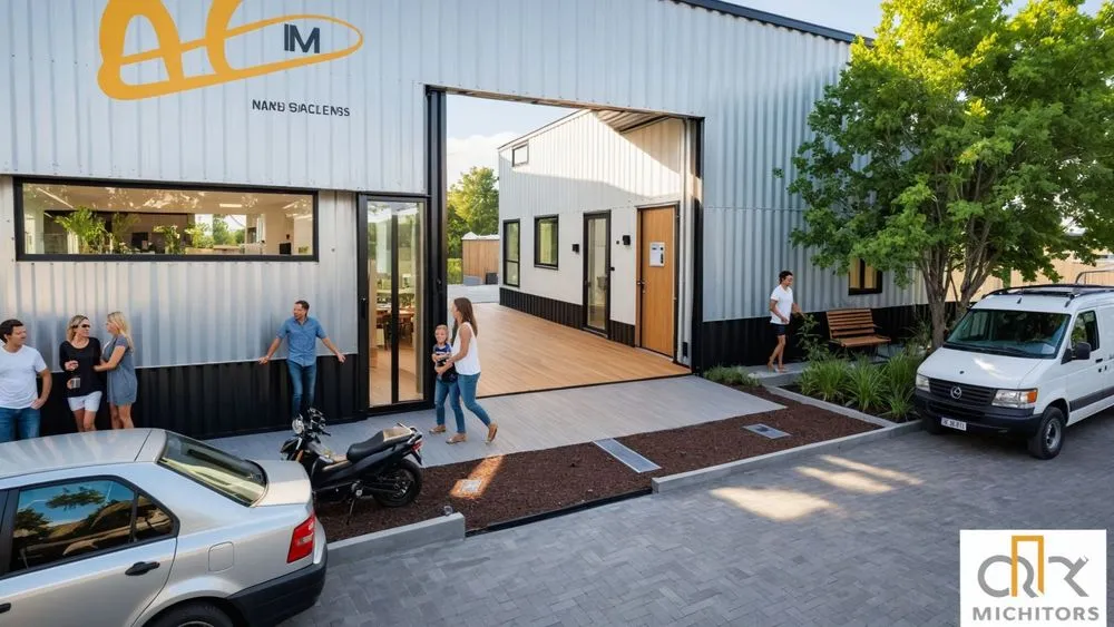 an outside courtyard with trees, a wooden bench and two modern style buildings
