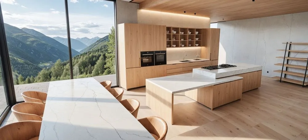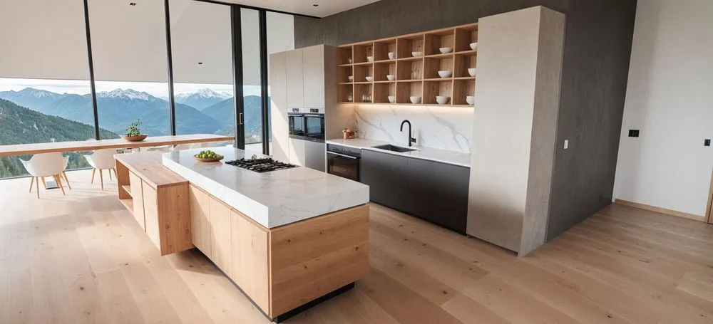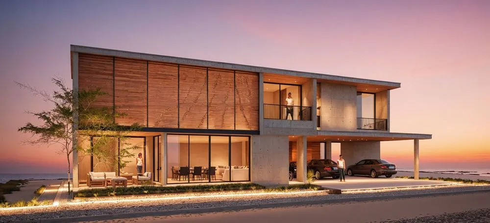a modern home with an interesting entrance on one side and plenty of windows on another