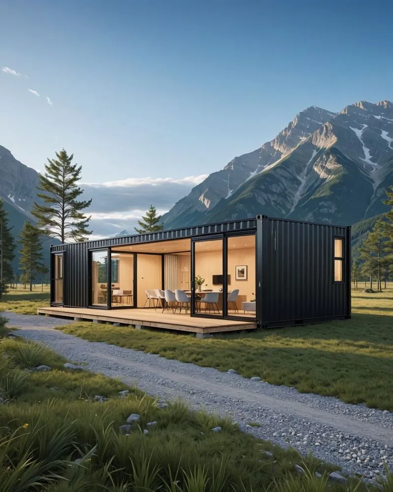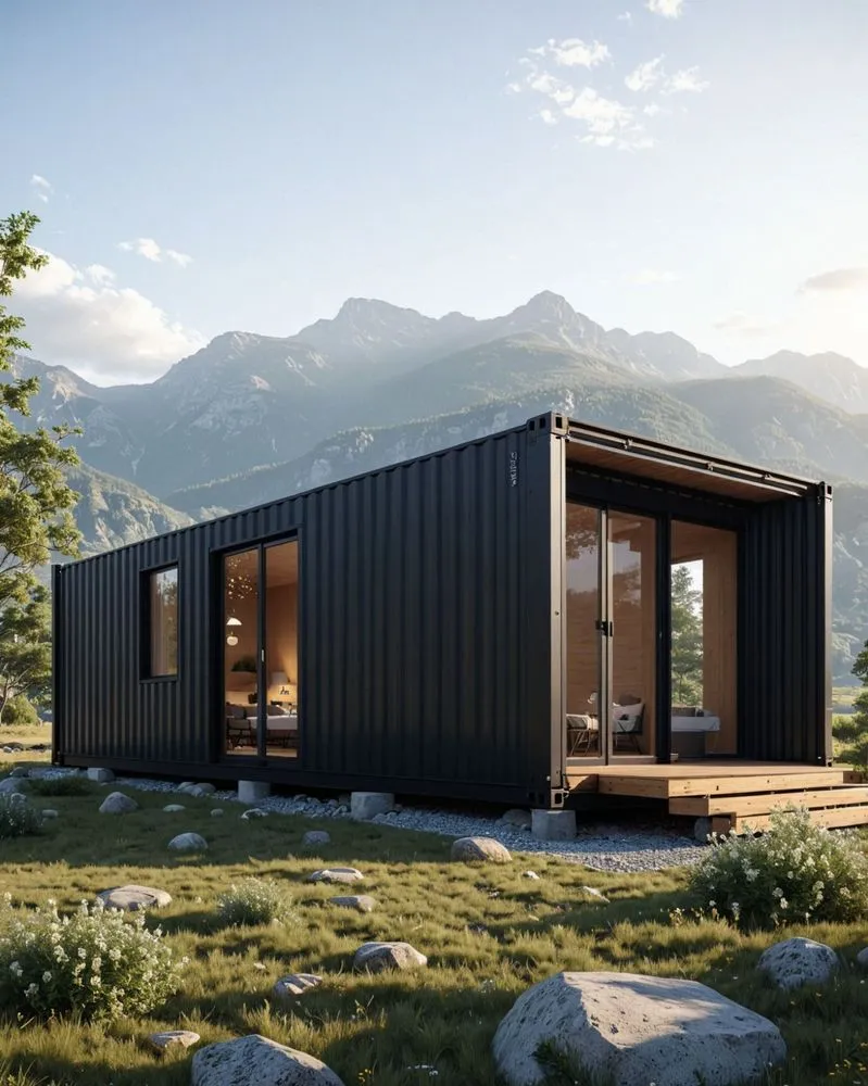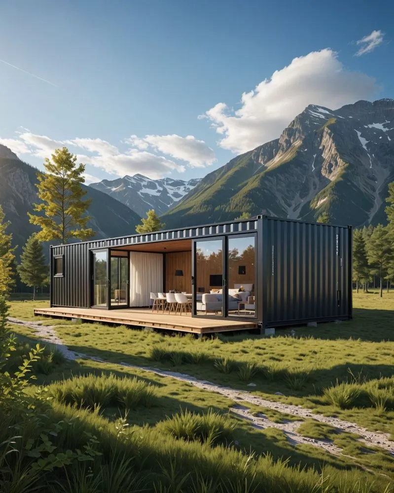 a house made out of a container and surrounded by mountains