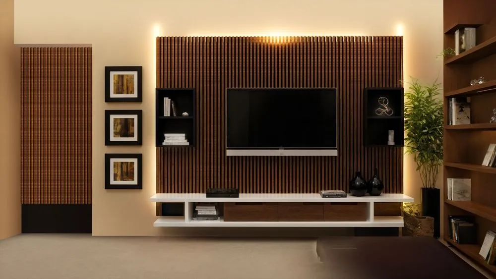 this living room has brown walls, a beige carpet and a wooden entertainment center