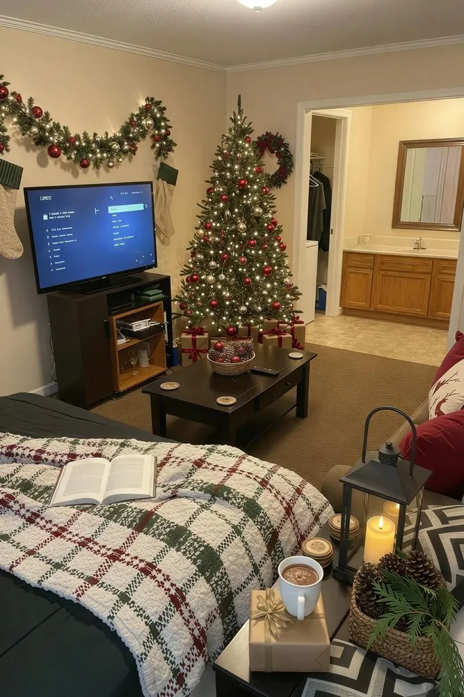 a christmas tree and stockings in a bedroom