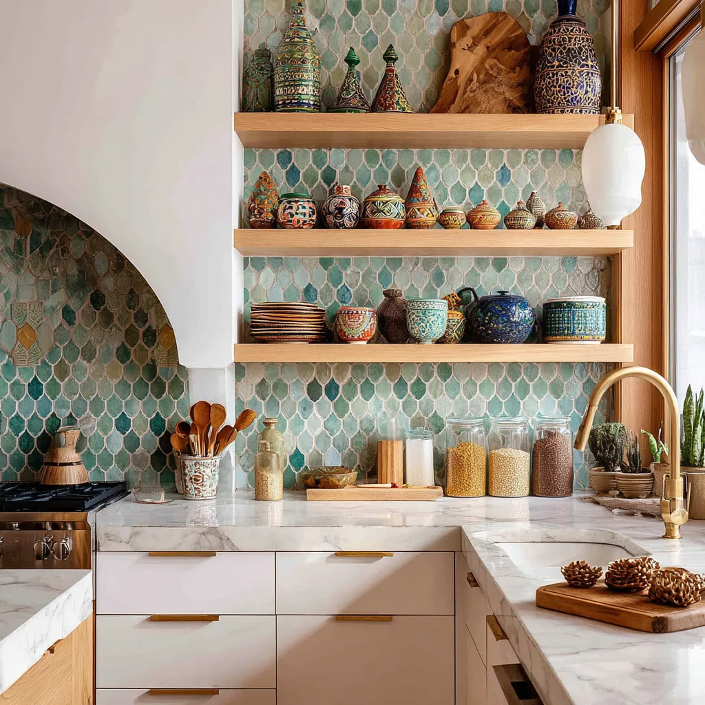 * **Artisan Cookware:** Display beautiful hand-painted ceramic bowls, unique wooden utensils, or colorful tagines. 🏺
