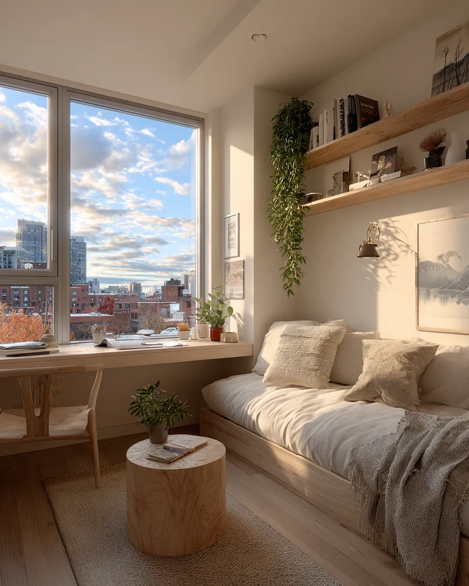 Transform your small space into a restorative haven. Save this for your studio apartment inspo! 💚 #BiophilicStudioApartmentIdeas#StudioApartmentIdeas#SmallSpaceDesign#BiophilicDesign#UrbanOasis#CompactLiving#NatureInSmallSpaces#BiophilicLiving#HomeDecor#ApartmentTherapy
