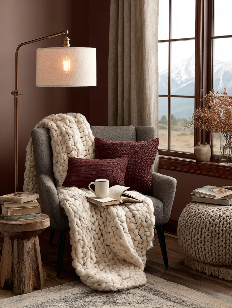 * **Layers of Texture:** Super soft blankets, knitted throws, and plush cushions.