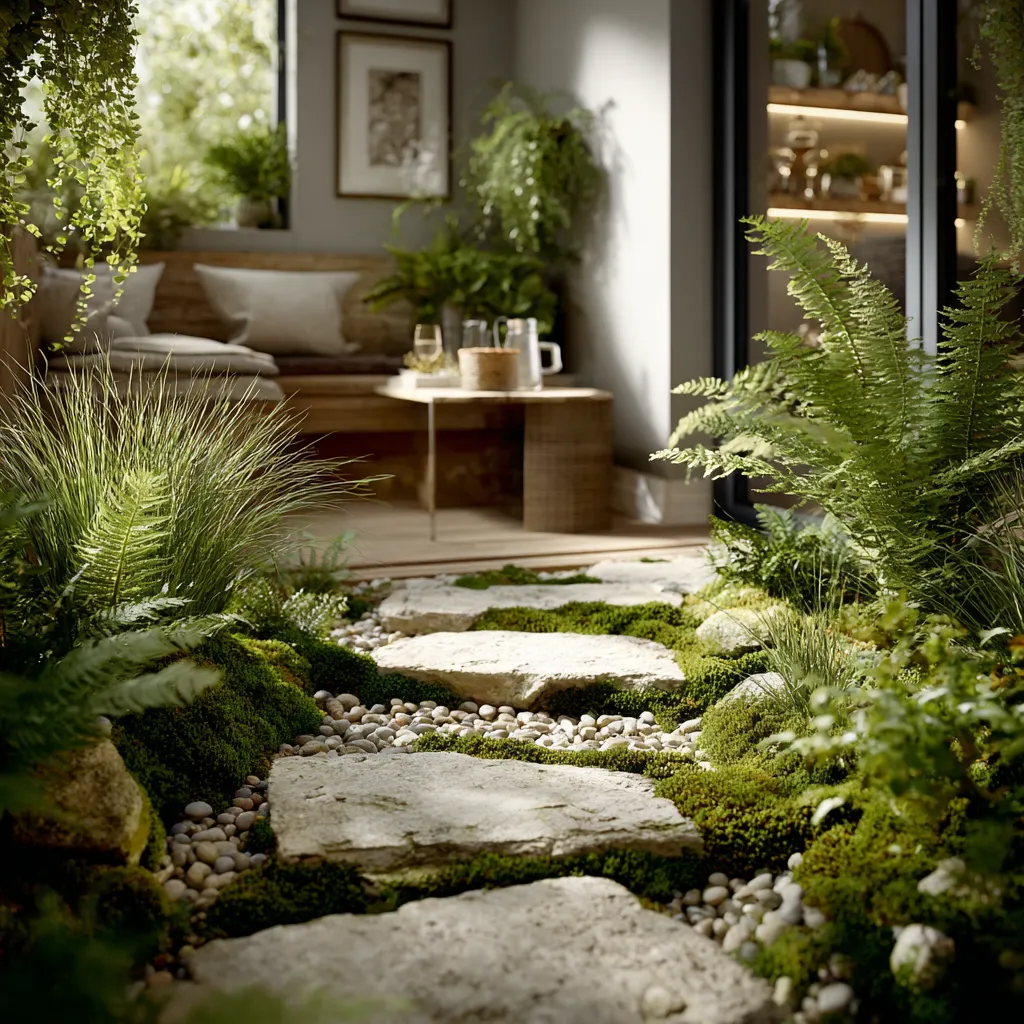 We favor natural materials like stone, gravel, or reclaimed wood for a grounded, organic feel.