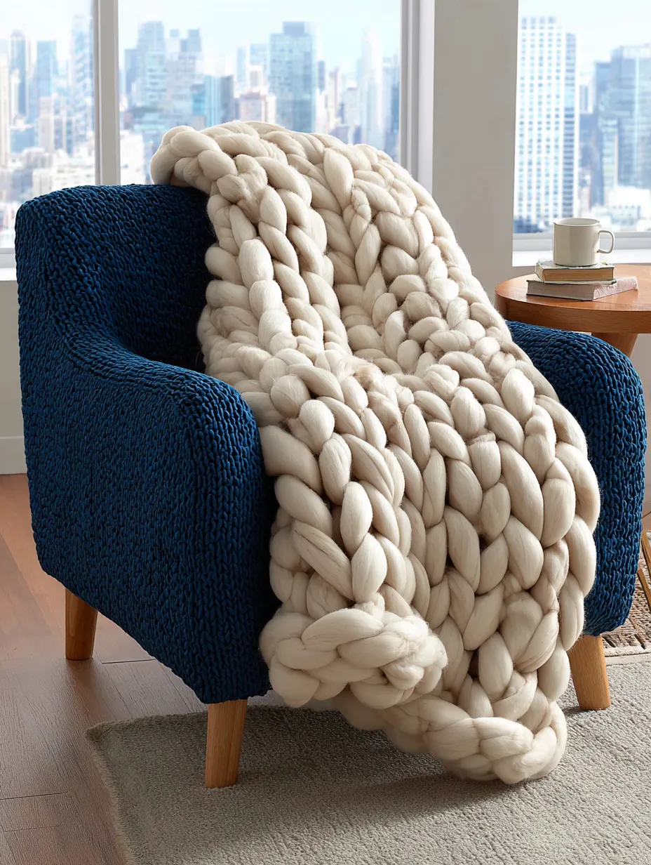 * **Throw Pillows:** Chunky cable knits, ribbed textures, or simple soft weaves.
