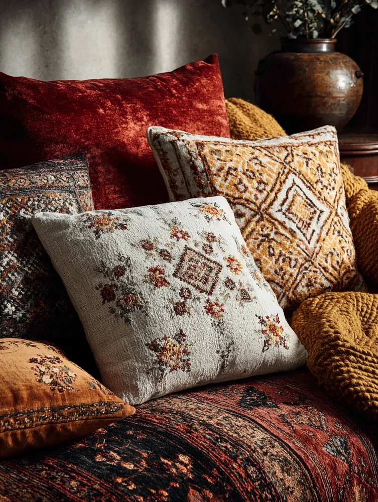 🌿 Patterned pillows: Mix and match global-inspired pillow covers – Kilim, ikat, or ethnic prints.