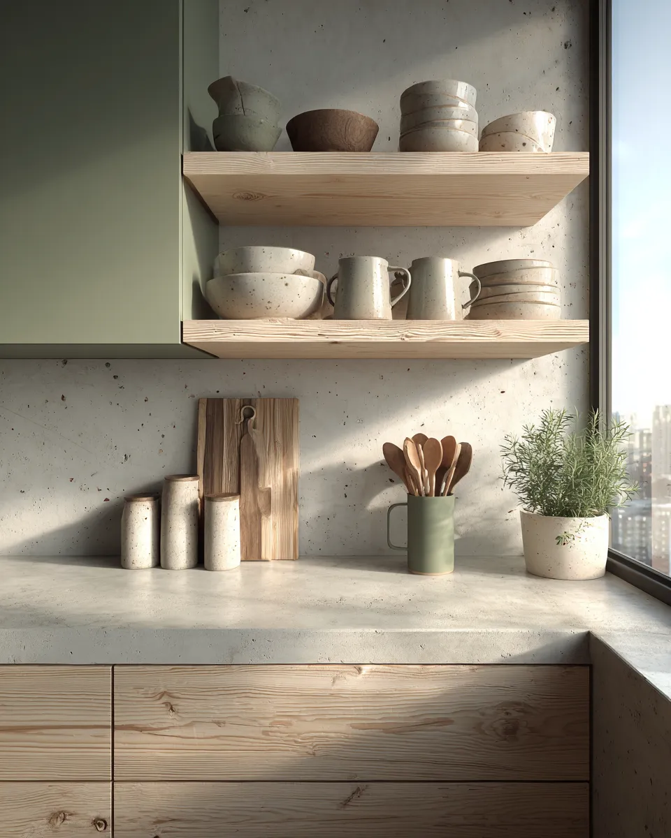 * **Open Shelving with Natural Wood:** Displaying select ceramic or stoneware pieces.