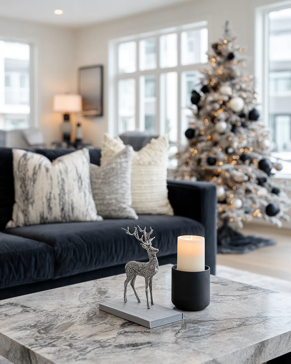 Instead of festive clutter, focus on textures: a plush black velvet tree skirt, charcoal grey stockings, and delicate white snowflake ornaments. The key is playing with light and shadow to create depth and mood. Think twinkling fairy lights against dark backdrops for that dramatic flair. It's the perfect way to infuse your holiday with a refined, artistic touch. 🌑