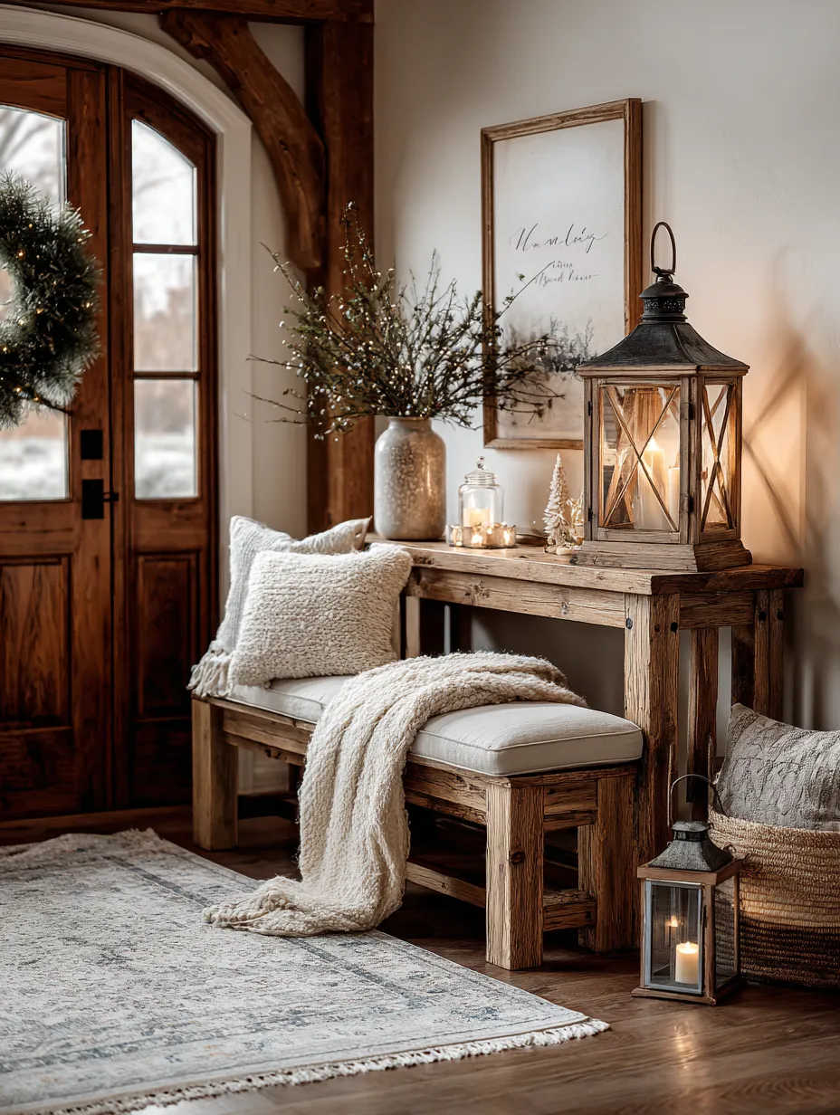 For a welcoming Christmas entryway, I love incorporating natural elements. Think a beautifully crafted wooden bench, layered with a faux sheepskin rug and a cozy throw.