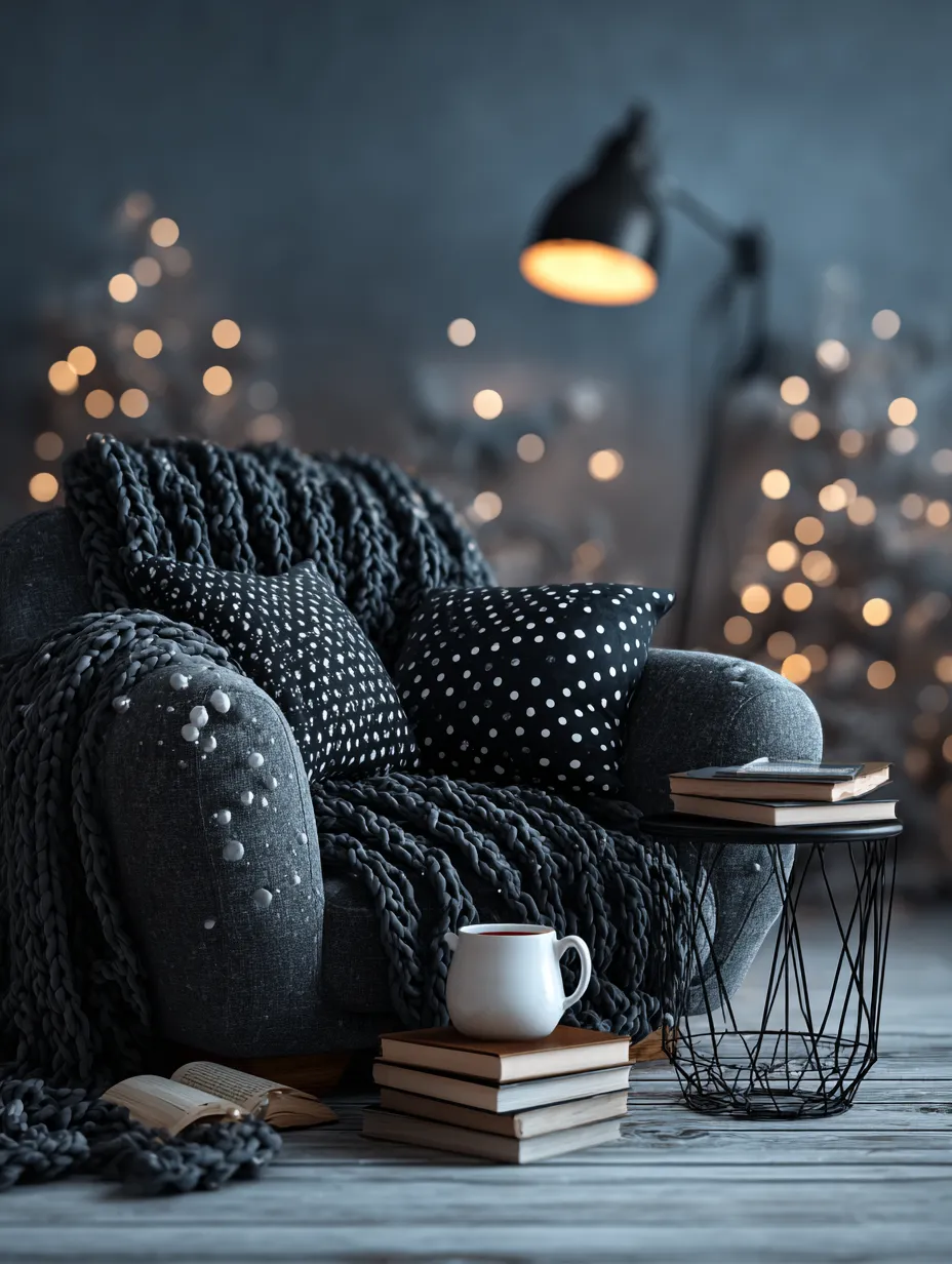 Imagine a plush, oversized armchair in charcoal grey, piled high with black and white textured throws and cushions. A sleek, minimalist side table holds a steaming mug and a stack of art books. The lighting should be warm and inviting, perhaps from a black minimalist lamp casting a soft glow. It’s the perfect spot for quiet reflection or enjoying a festive read.