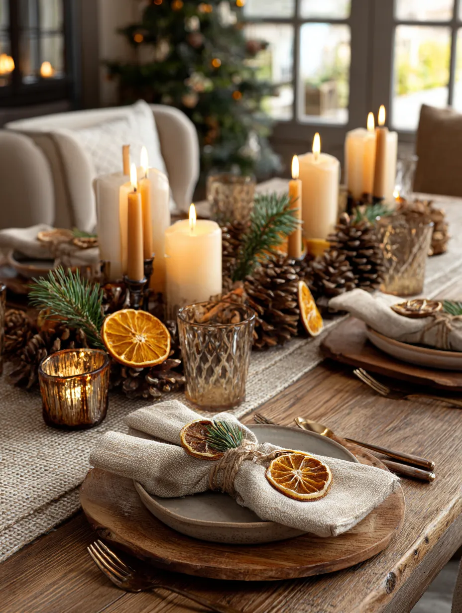 Imagine a table adorned with a linen runner, beeswax candles in antique holders, and a centerpiece crafted from foraged pine branches, dried fruits, and evergreen sprigs. Use ceramic or wooden plates and cloth napkins for a refined touch.
