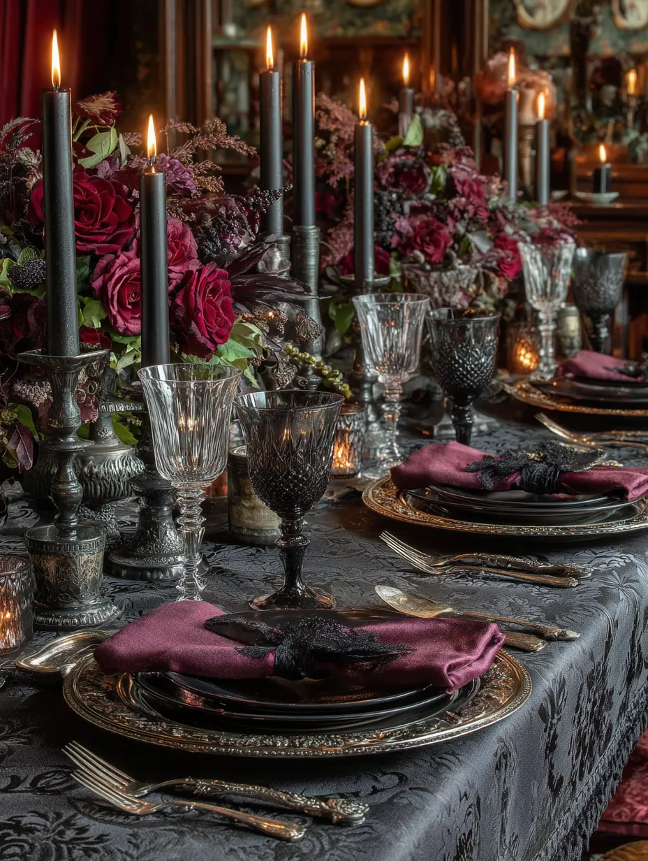 Imagine antique silverware, heavy damask placemats, and crystal goblets that catch the candlelight. Centerpieces featuring dark florals, black taper candles, and subtle raven or bat motifs add the perfect eerie elegance. It's all about creating an unforgettable, theatrical experience for your guests.
