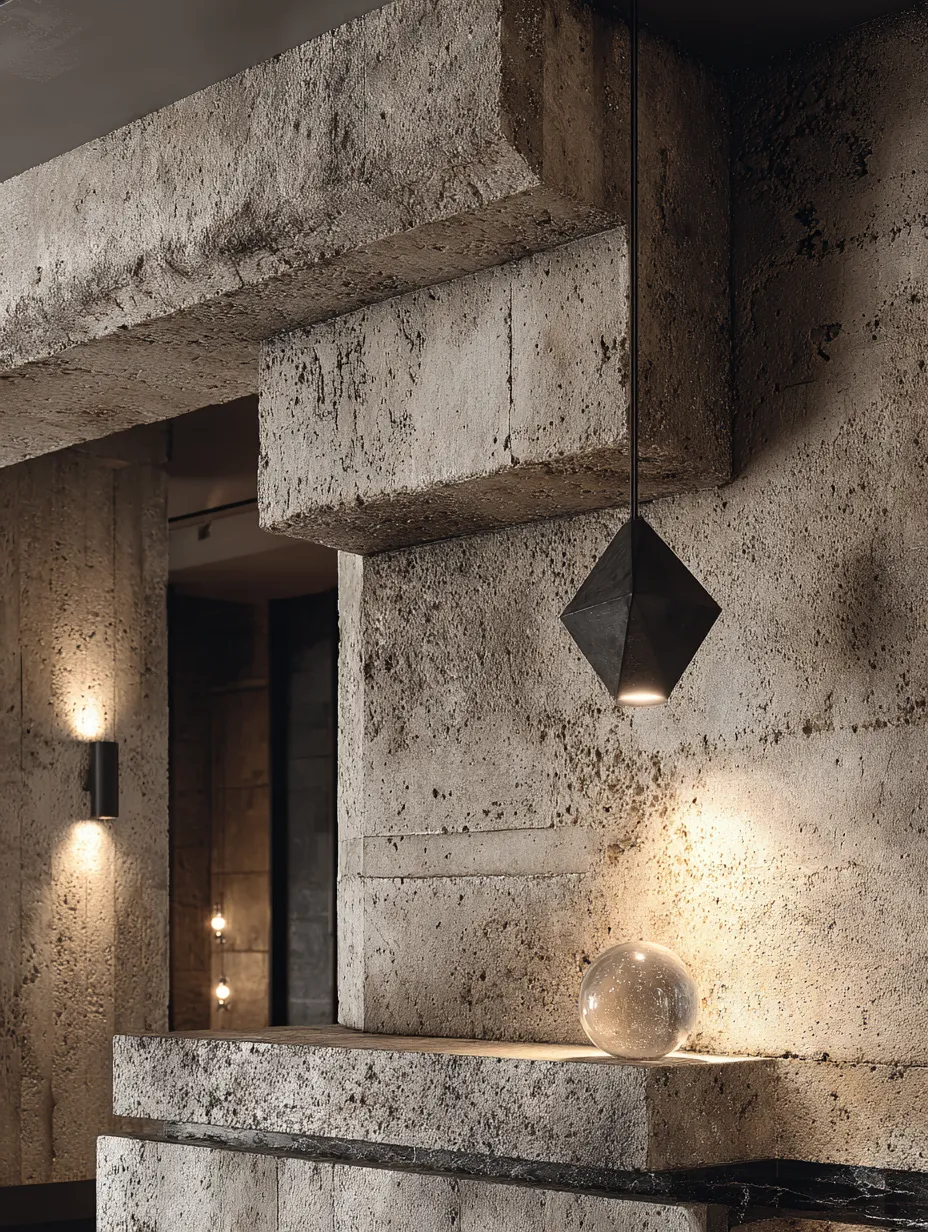 Creating a moody, sophisticated holiday atmosphere has never been easier. Save these ideas for your next festive celebration! #BrutalistLightingIdeas#ChristmasLightingIdeas#MoodyDecor#IndustrialDecor#HomeLightingIdeas#HolidayLighting#ArchitecturalLighting#ConcreteInteriors#StatementLighting#BrutalistHome