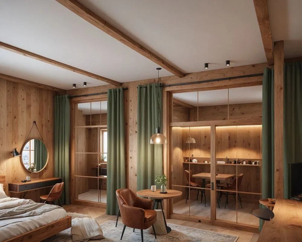 the room is furnished with wooden paneled walls and green drapes