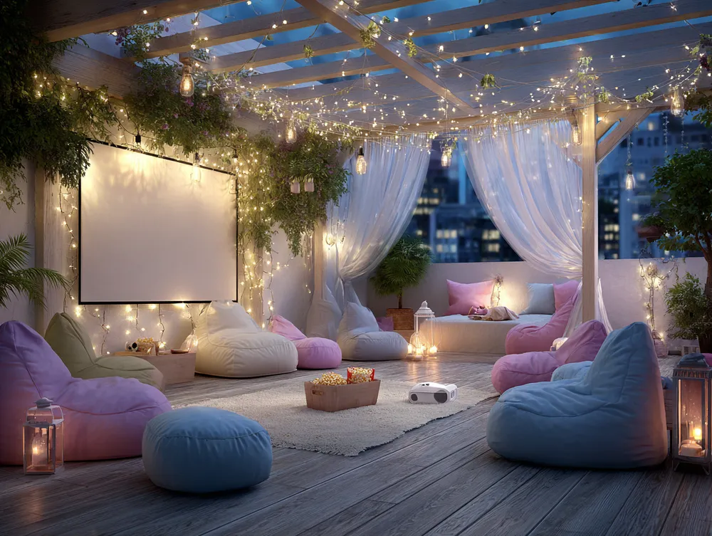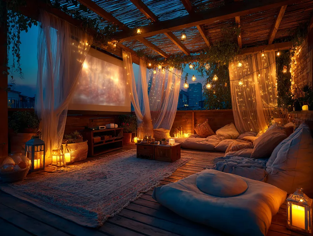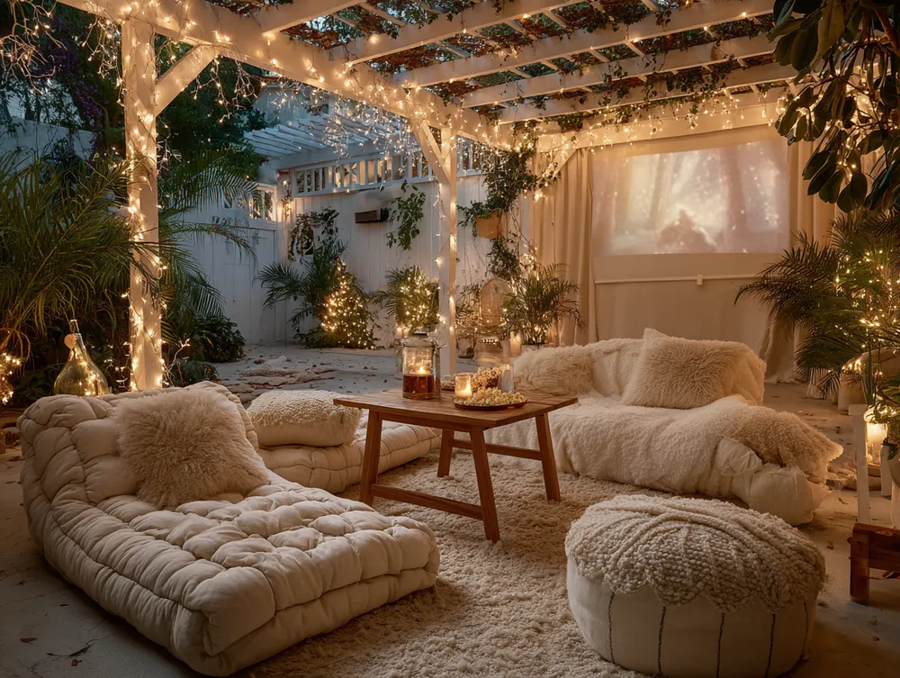 When setting up your outdoor movie area, consider the projection surface. A white sheet, a blank wall, or even a portable projector screen can work wonders. I always add blankets, pillows, and ambient lighting to create a cozy and inviting atmosphere.