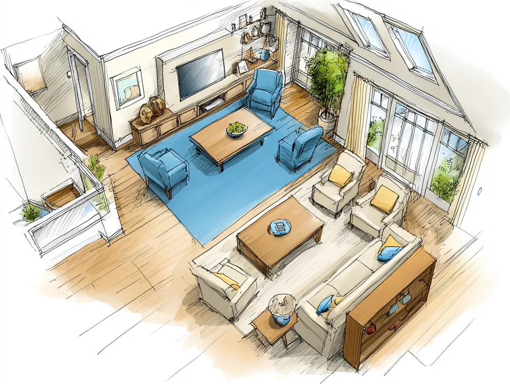 Zoning: toy bins & soft rugs for play, cozy sofa nook for adults