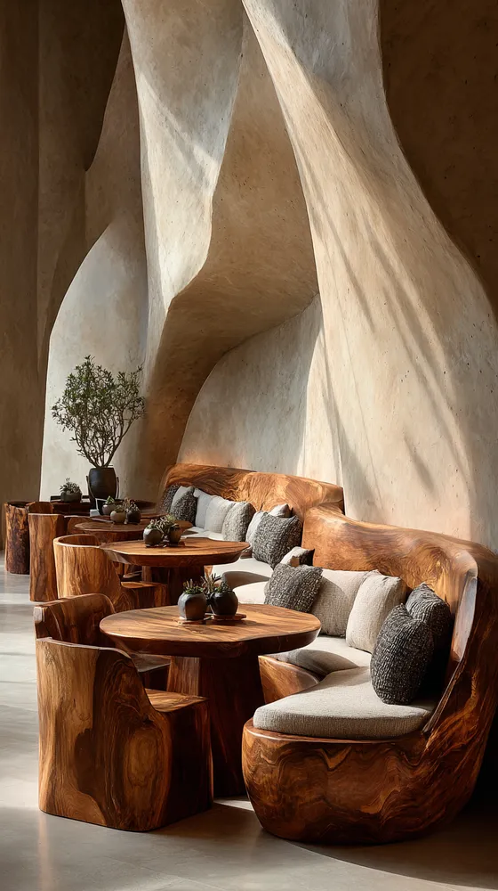 🪑 Add curved, sculptural wooden furniture with rounded edges for a soft, organic feel that’s both comfortable and stylish.