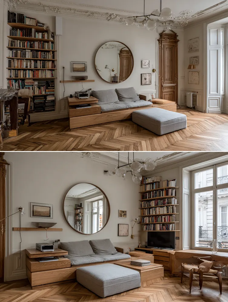 – Swap that hard jackknife sofa for a futon or modular sleeper that folds to a bed + living area 🛏️
