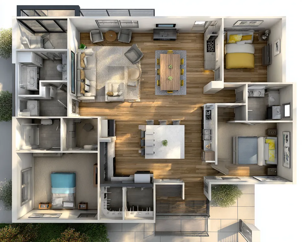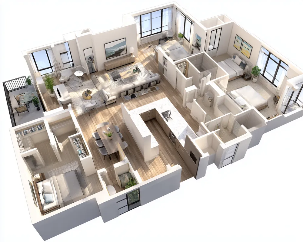 Large families ≠ chaotic layouts. Strategic acoustic zoning separates activity areas: [Teen Zone] Bedrooms clustered with shared study lounge Sound-buffered by laundry room (STC 55+ walls) [Parents' Wing] Master suite + private office over garage Separated by courtyard (15m sound attenuation) Pro tip: Run HVAC zones independently – kids’ night temps at 20°C vs. parents’ 18°C saves 23% energy.