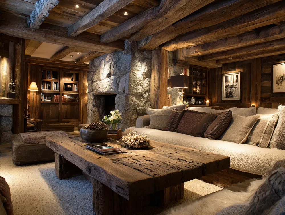 Embrace the soul of mountain living with a rustic living room that cocoons you in warmth. 🌲 At Chalet Charm, we love the interplay of rich wood tones and inviting textures. Think exposed beams, a substantial wooden coffee table, and a palette of earthy hues. Layering soft blankets and plush cushions creates an irresistible cozy factor. This space is designed for ultimate relaxation and connection. Creating a haven that feels both luxurious and grounded is our specialty. Save for your dream living space! 🏔️🛋️
