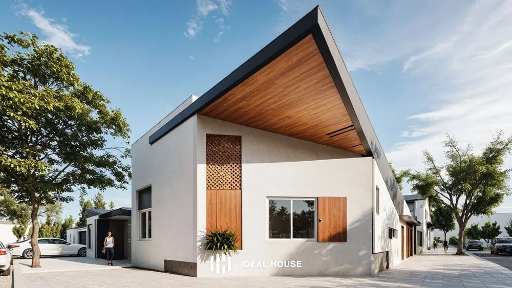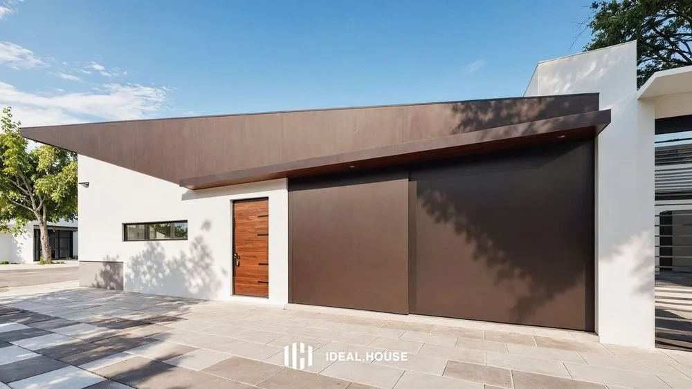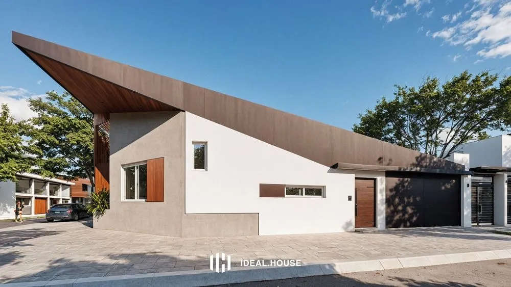 Single-story single-family home, modern architecture, minimalist facade with a sloping asymmetrical brown sheet metal roof, white walls, black sheet metal gate and dark wood door, elongated horizontal windows, clean and geometric composition, urban setting with trees and parked cars, realistic rendering style, bright morning atmosphere with wispy clouds. Vivienda unifamiliar de una planta, arquitectura moderna, fachada minimalista con techo inclinado asimétrico en chapa marrón, muros blancos, portón de chapa negra y puerta de madera oscura, ventanas horizontales alargadas, composición limpia y geométrica, entorno urbano con árboles y autos estacionados, estilo de representación tipo render realista, atmósfera matutina brillante con nubes tenues.