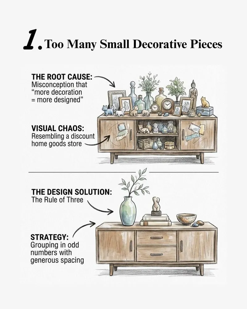 THE 10 CORE MISTAKES: The Complete List with Solutions 1. Too Many Small Decorative Pieces 2. Poor Lighting Choices 3. Forgetting Scale and Proportion 4. Picking the Wrong Paint Color 5. Hanging Artwork Too High 6. Using Fake Plants and Flowers 7. Mismatched or Cheap-Looking Hardware 8. Omission of Quality Window Treatments 9. Over-Matching Furniture 10. Disregarding Quality Textiles