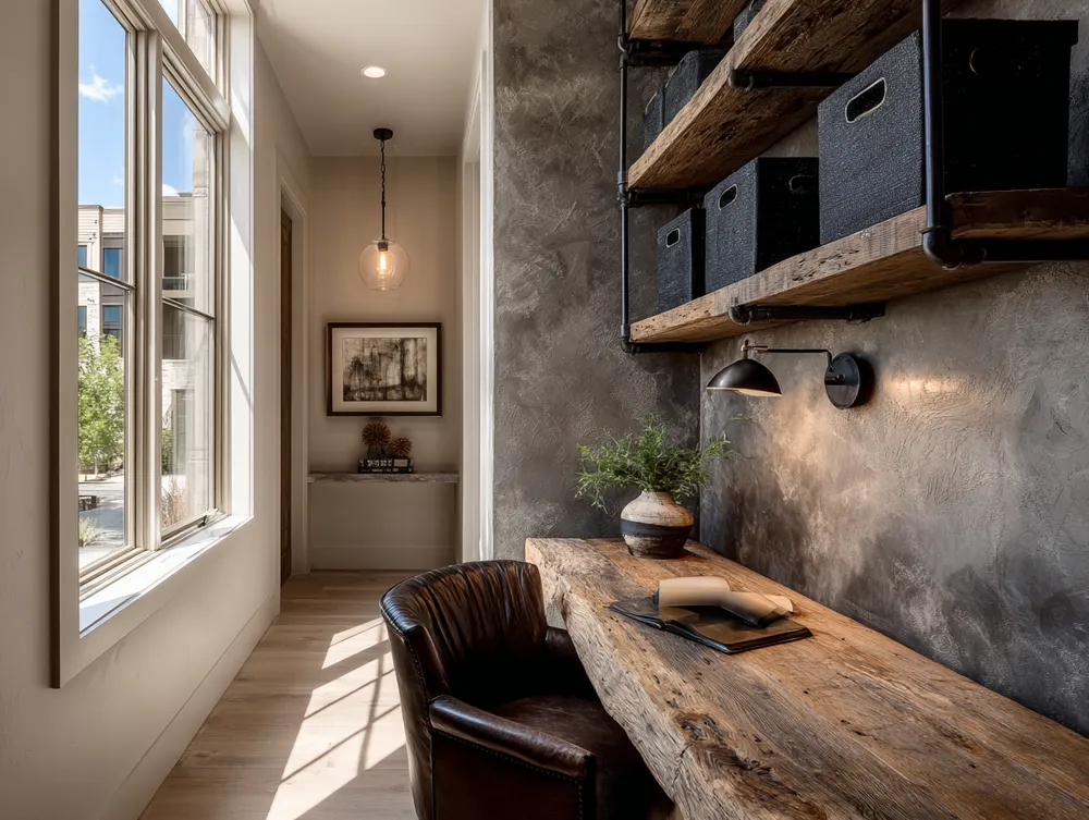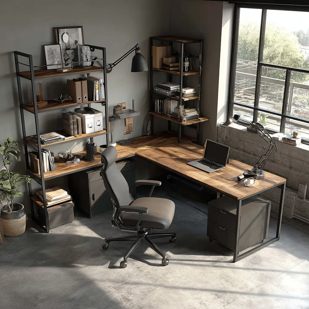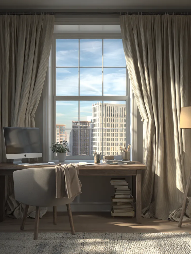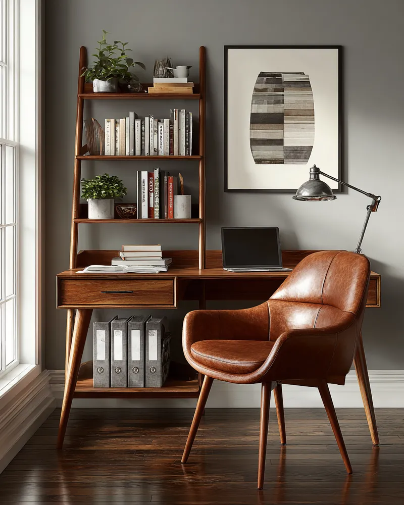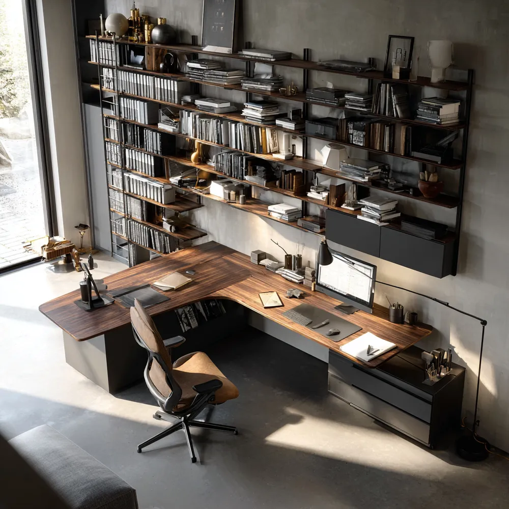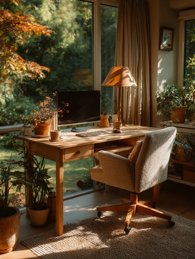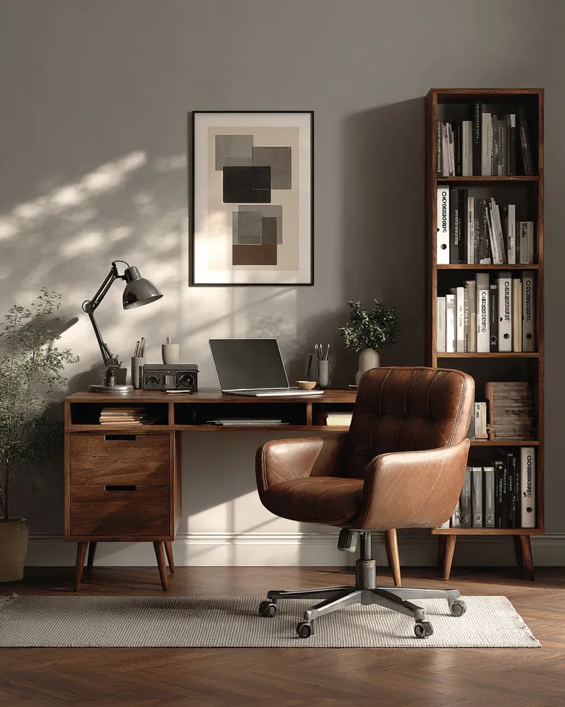תיצור לי . חדר עבודה במידות 2.20×3.20 על פי התמונה שהעלתי שיהיה בו שני כורסאות שולחן ארונית למדפים ומדפים או קלאפה עם מנורה מעוצבת שטיח עציץ בגוונים רגועים צריכה שיהיה ארון של שני דלתות גבוה