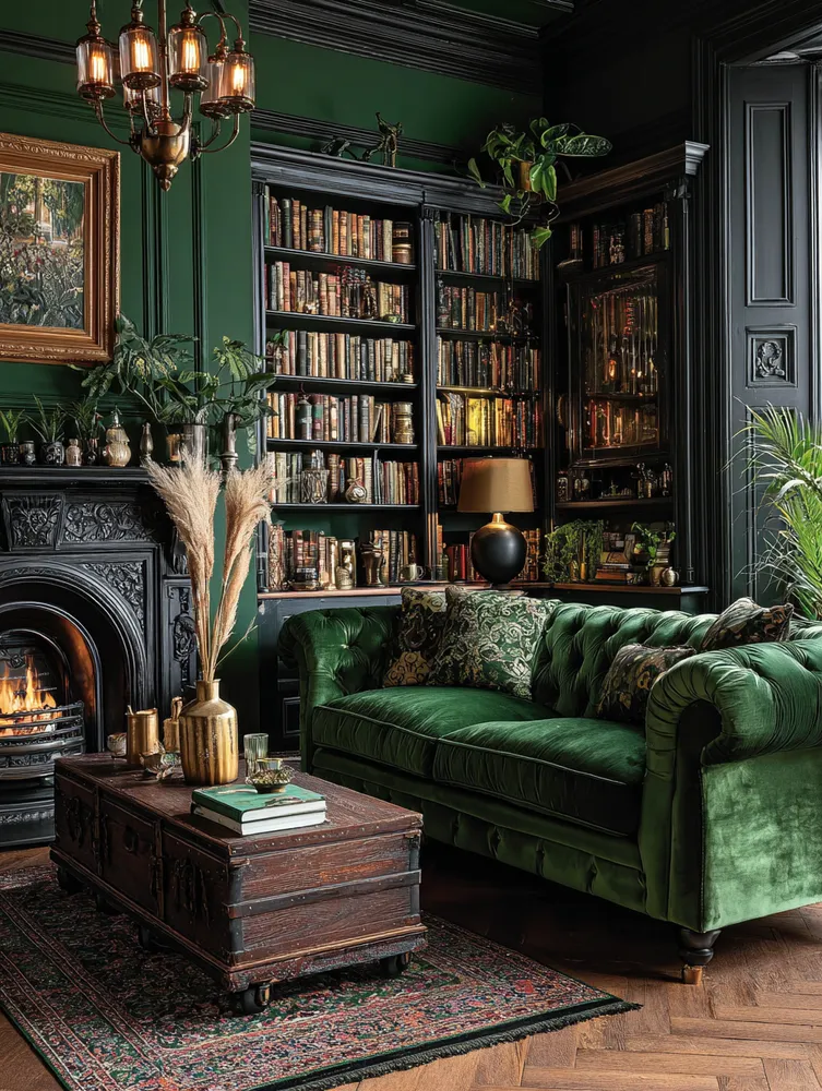 Transform your living room into a haven of Art Deco glamour! This style is all about making a bold statement with luxurious materials and striking geometry. Imagine plush velvet sofas in jewel tones, paired with sleek metallic accents in brass or gold. A dramatic fireplace surround and an eye-catching geometric rug will be focal points. Don't shy away from symmetry and opulent details like statement lighting and decorative mirrors. It's about creating a space that feels both grand and inviting. Save this for your ultimate living room inspo! 🖤