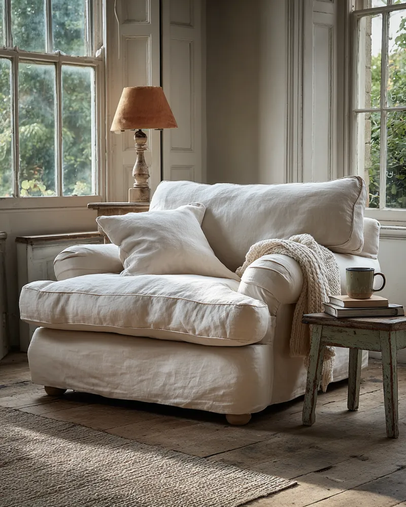 Craving a cozy nook? Our modern farmhouse lounge corner is the epitome of relaxed comfort. Think plush, oversized armchairs upholstered in natural fabrics like linen or cotton, nestled beside a rustic wooden side table. 🤍 Add a soft, textured rug, a cozy throw, and a warm lamp for ambient lighting. It’s the perfect spot to unwind with a book or a cup of tea. Save this for your ultimate relaxation zone inspo! 🌾