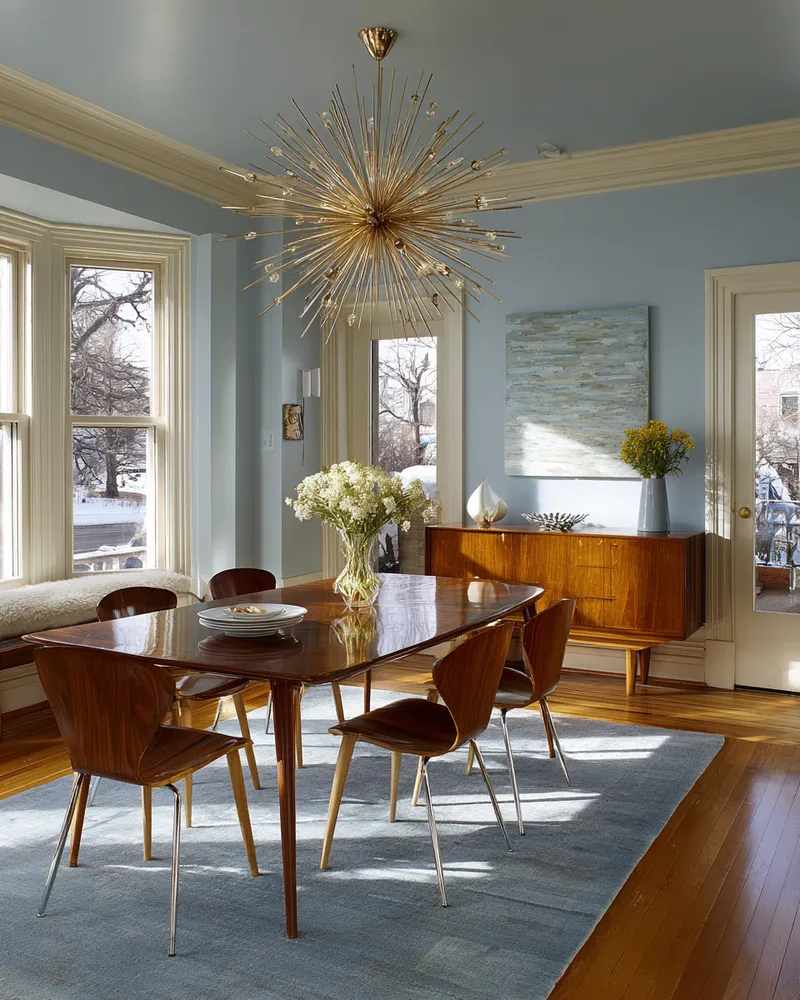 Your dining room is where gatherings happen. Make it timelessly elegant with Mid-Century Modern design principles! ✨ Achieve MCM dining perfection: • **Sculptural Dining Table:** Opt for a walnut or teak table, perhaps with a slightly rounded or oval shape. • **Iconic Chairs:** Comfortable, stylish chairs with tapered legs and molded seats are a must. • **Statement Lighting:** A Sputnik chandelier or a series of globe pendants overhead. • **Minimalist Buffet/Sideboard:** Functional storage with clean lines in a complementary wood tone. • **Subtle Accents:** A centerpiece with a few stems or a minimalist table runner. Create a space for memorable meals! 🥂