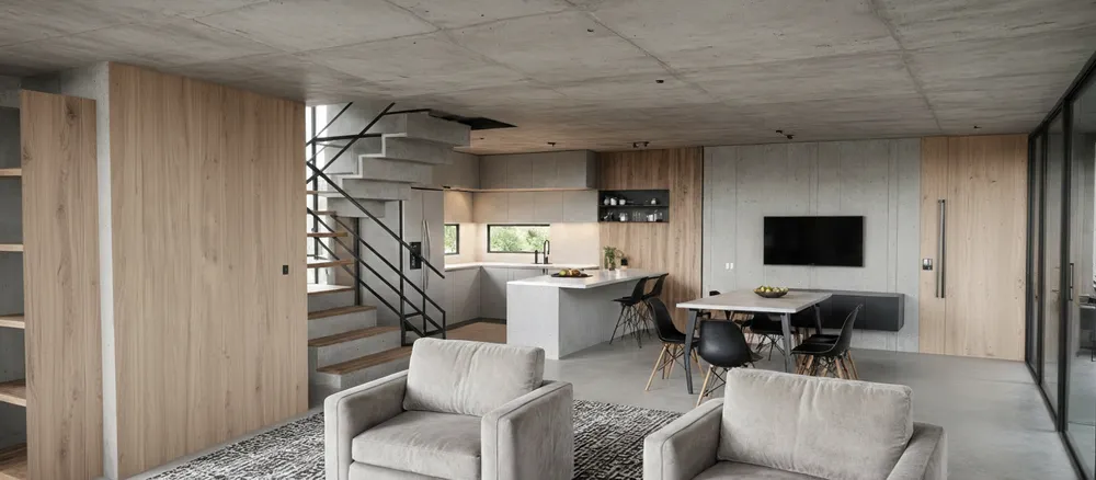 Vista arquitectónica fotorrealista de una casa de playa moderna de 2 pisos, con diseño de líneas limpias y geometría definida. La estructura utiliza materiales naturales como piedra clara, vidrio templado y concreto expuesto en tonos neutros. En el lado derecho, puertas correderas de vidrio integran perfectamente los espacios interiores con una terraza y piscina exterior. Iluminación natural diurna con sombras realistas, cielo despejado, vegetación tropical baja y un camino de entrada minimalista. Proporciones arquitectónicas precisas, colores naturales como blanco cálido, gris claro, beige arena y detalles en madera. Alto nivel de detalle, render estilo fotorrealista, vista en perspectiva angular.