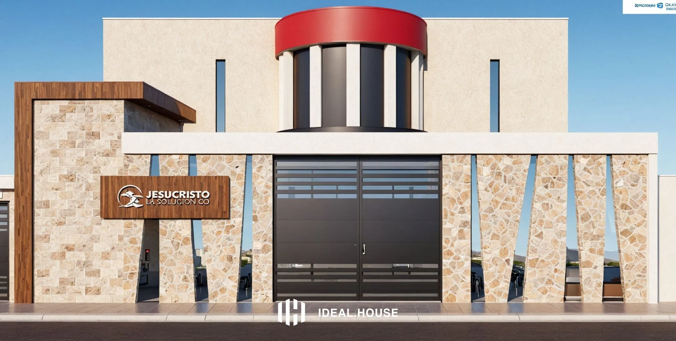 A 3d rendering of a modern building with a unique architectural design. The building is a two-story structure with a flat, rectangular shape and a red, circular top. The exterior of the building is made of light-colored stone with a textured, geometric pattern. The entrance is flanked by two large, black doors with horizontal slats. on the left side of the entrance, there is a wooden sign that reads "JESUCRISTO LA SOLUTION CO." The building has a simple, minimalist design with no other elements present. the sky in the background is clear and blue.