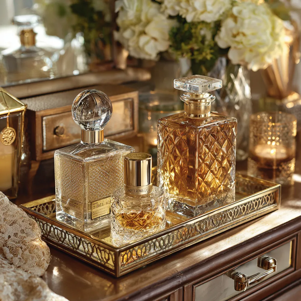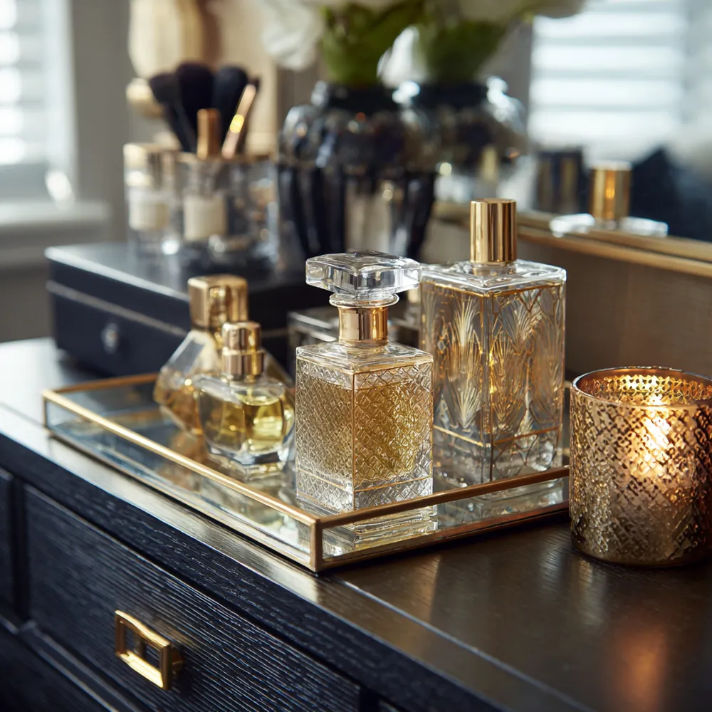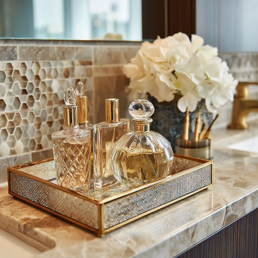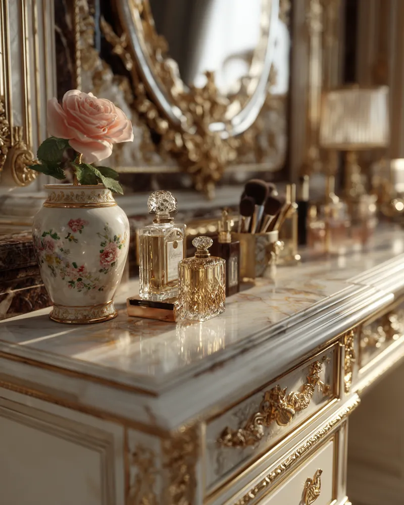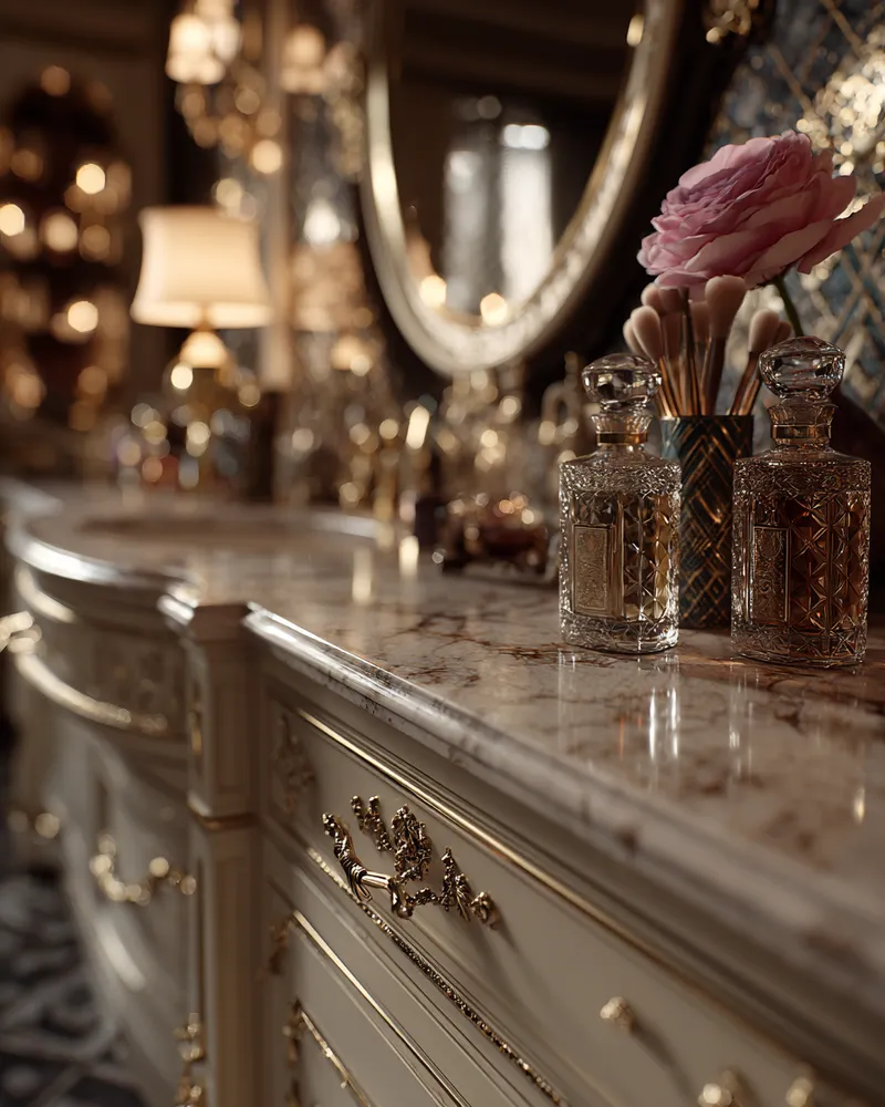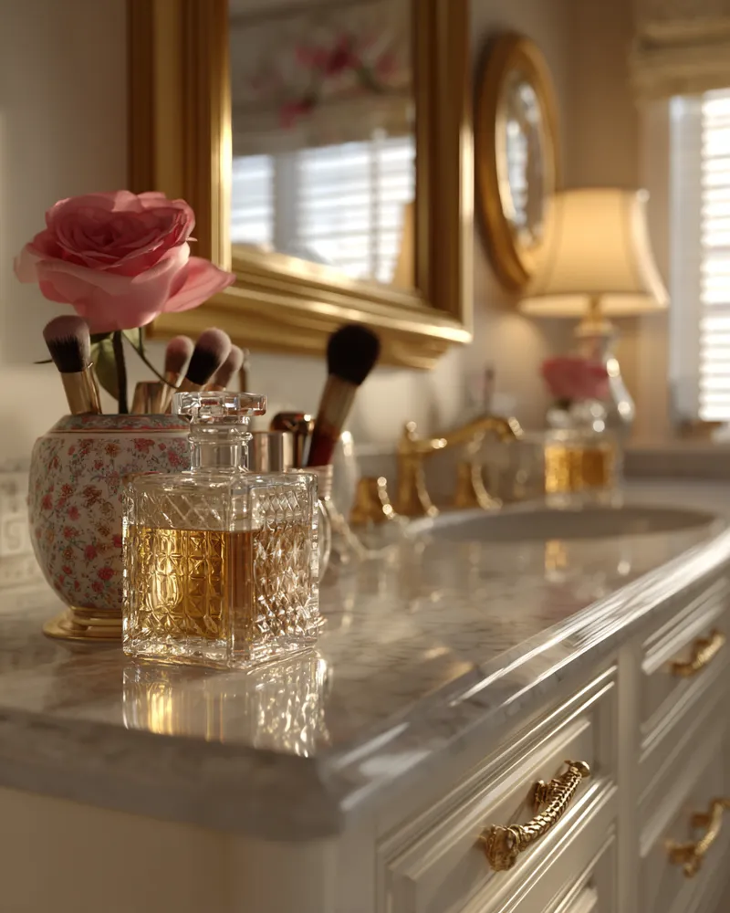Your vanity area should be a haven of refined beauty and organized glamour. Let's infuse it with details that exude sophistication and create a serene escape. 🥂 Opt for a vanity with a marble or polished wood top and elegant hardware. Style it with a beautiful perfume collection displayed in crystal decanters. Add a set of luxe makeup brushes in a decorative holder and a striking mirror, perhaps with a gilded frame. Incorporate soft lighting with a chic vanity lamp and arrange a small floral accent for a touch of elegance. This curated space adds a daily dose of luxury. What's your favorite vanity accessory?
