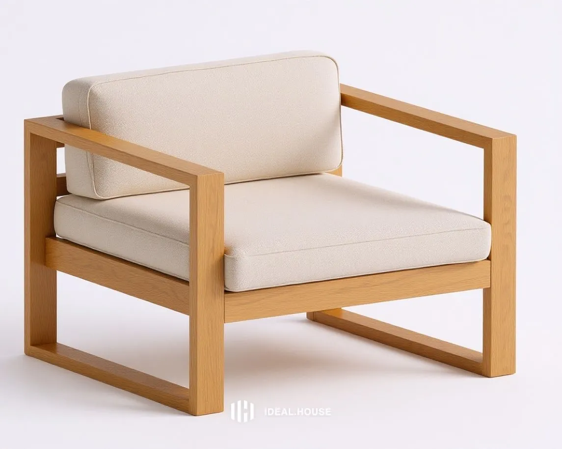 A modern wooden chair with a light beige fabric seat and backrest. the chair has a simple, minimalist design with clean lines and a natural finish. The frame is made of light-colored wood with a smooth finish, and the seat is upholstered in a neutral fabric with a subtle texture. the backrest is slightly curved, adding a touch of elegance to the overall look. the overall design is minimalistic and minimalistic, with a focus on the natural wood grain and texture of the chair. the background is plain white, making the chair the focal point of the image.