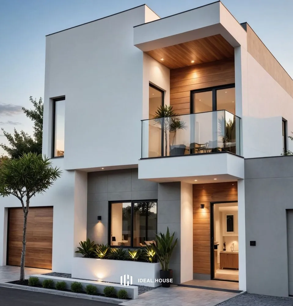 Modern two-story house with a sleek contemporary design. Clean, symmetrical lines on the facade. A wide, stylish canopy covering both the main entrance and a double-car garage, supported by modern pillars. Large floor-to-ceiling windows with black or dark grey frames on both levels. Exterior materials include smooth concrete, natural wood panels, glass, and stone accents. Modern color palette: white, charcoal grey, matte black, and warm wood tones. Flat roof, architectural LED exterior lighting, and a minimalist front garden with grass and ornamental plants. Daytime lighting, clear sky.