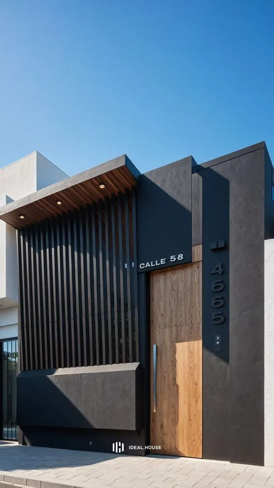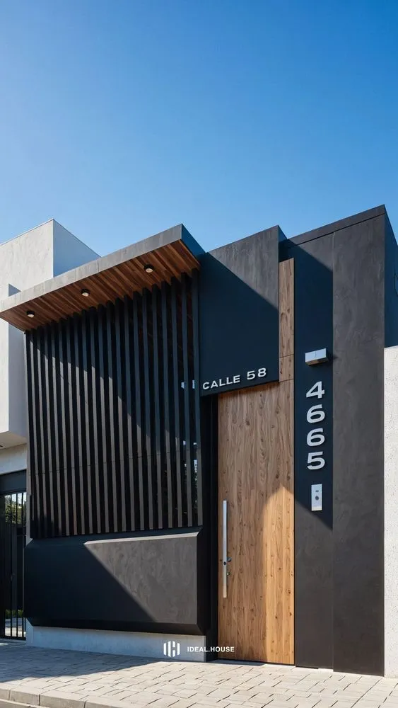Modern residential facade, minimalist design, vertical black slats, wood entrance door with natural grain, dark matte metal volumes, integrated street number and name "CALLE 58", wooden soffit with recessed lights, clean lines, urban setting, neutral tones, high contrast, architectural render, sunny day, front view.