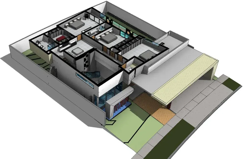 Modern two-story house with a sleek contemporary design. Clean, symmetrical lines on the facade. A wide, stylish canopy covering both the main entrance and a double-car garage, supported by modern pillars. Large floor-to-ceiling windows with black or dark grey frames on both levels. Exterior materials include smooth concrete, natural wood panels, glass, and stone accents. Modern color palette: white, charcoal grey, matte black, and warm wood tones. Flat roof, architectural LED exterior lighting, and a minimalist front garden with grass and ornamental plants. Daytime lighting, clear sky.