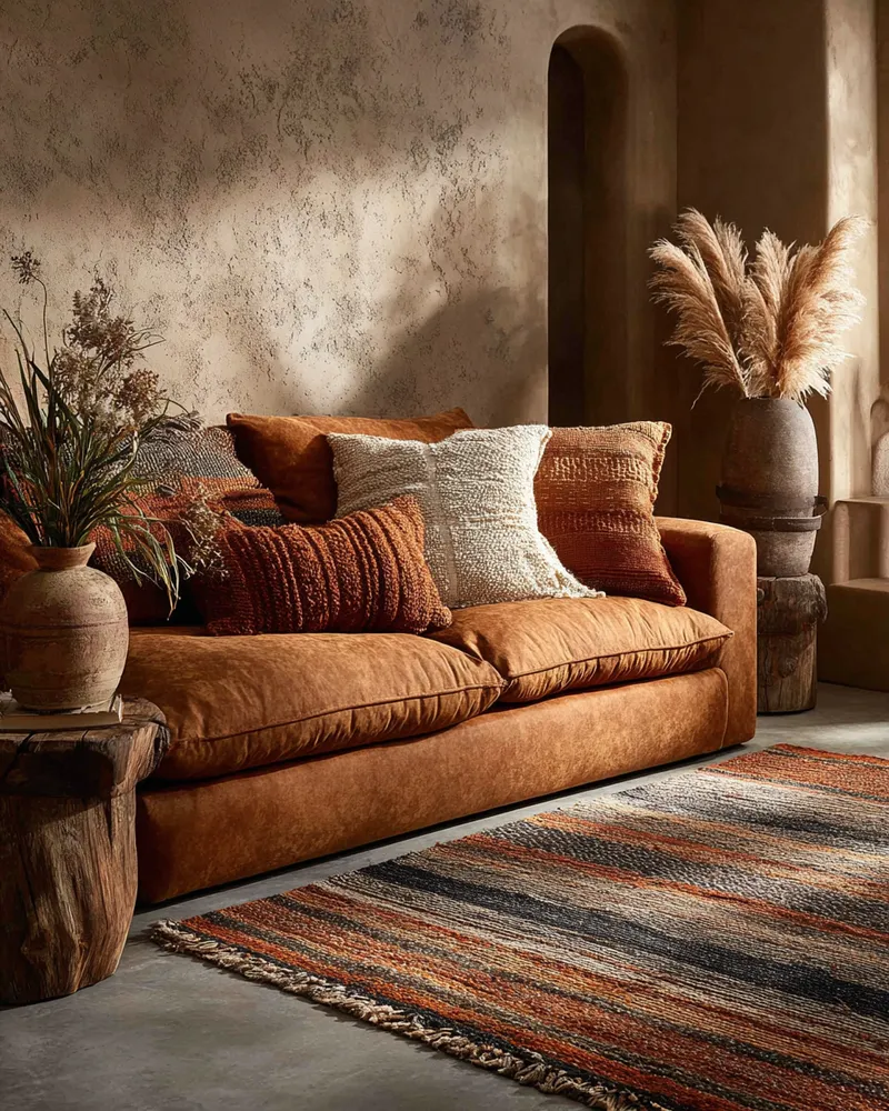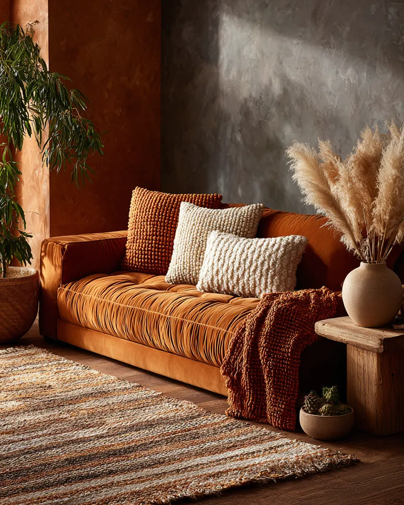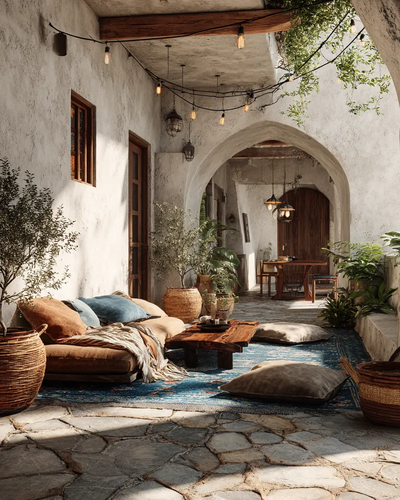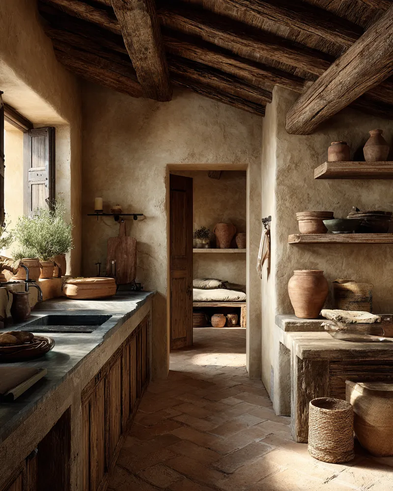 Choose furniture that is simple and functional, often handcrafted from natural wood. The look should be minimalist but cozy. Decorate with rustic ceramics, woven baskets, and hand-painted tiles to add personality.