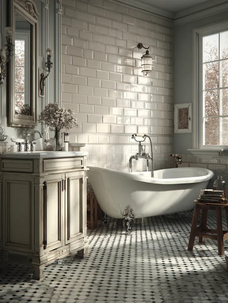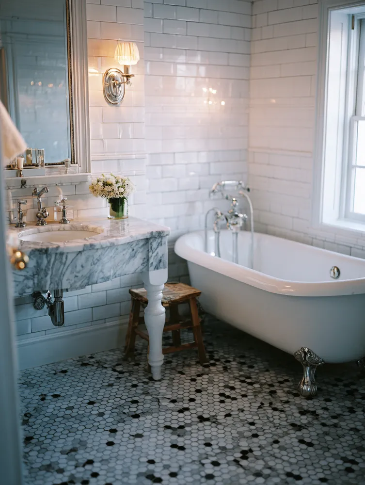 * **Tiles:** Hexagonal, subway, or penny tiles in classic colors or subtle patterns.