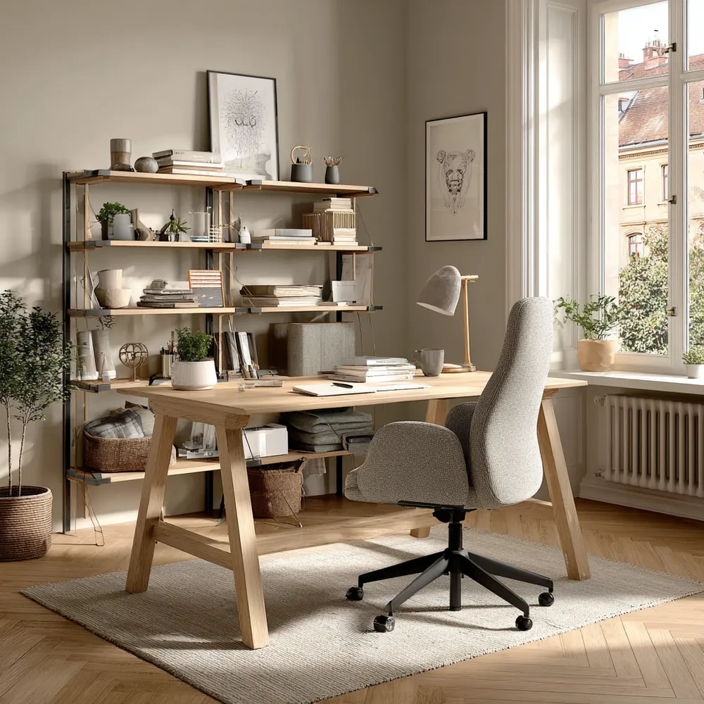 Design a home office that fosters focus and peace with Japandi principles. It's about a clean, uncluttered space that inspires calm productivity. Opt for a desk with simple, geometric lines in a natural wood finish. 🪵 Pair it with an ergonomic yet stylish chair. Keep your desk surface clear, displaying only essentials like a minimalist lamp, a notebook, and a small plant. Wall-mounted shelves in a light wood can organize books and decorative items. Natural light is vital – position your workspace to maximize daylight. This thoughtful arrangement creates an environment where you can truly concentrate. 🌿 #japandiworkideas#homeofficeideas#minimalistworkspace#officedesign#studynook#japandi#scandistyle#workfromhome#productivitytips#decorinspiration