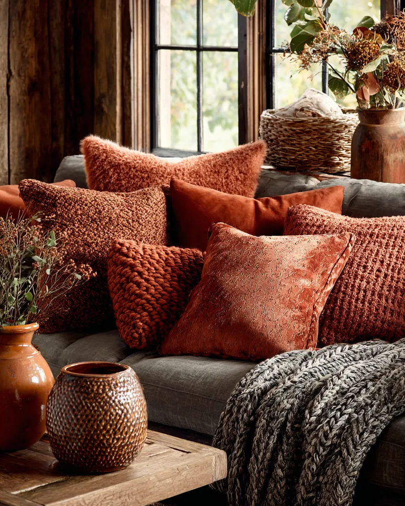 Begin with a comfortable base – a sofa that invites lounging. Layer it with a mix of patterned throw pillows and a soft, chunky knit throw. Introduce a large, vintage-inspired rug with rich colors and intricate designs.