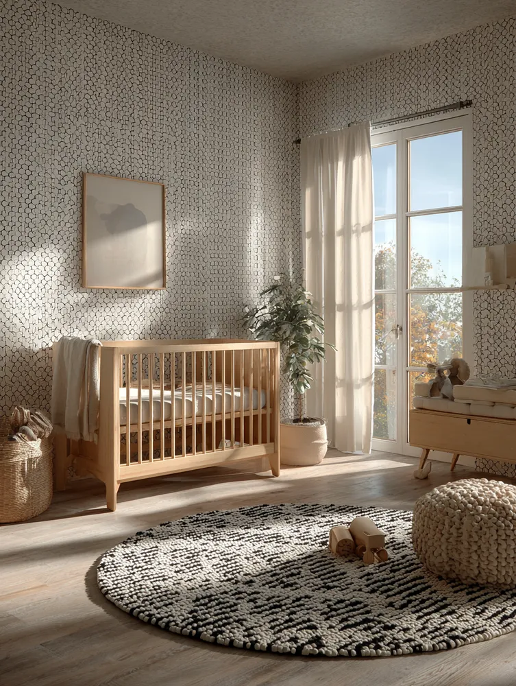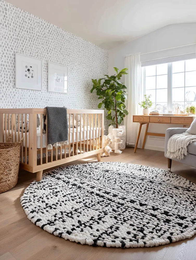 Opt for a soft, neutral color palette as your base. Layer in textures with organic cotton bedding, a plush woven rug, and natural wood crib and changing table.